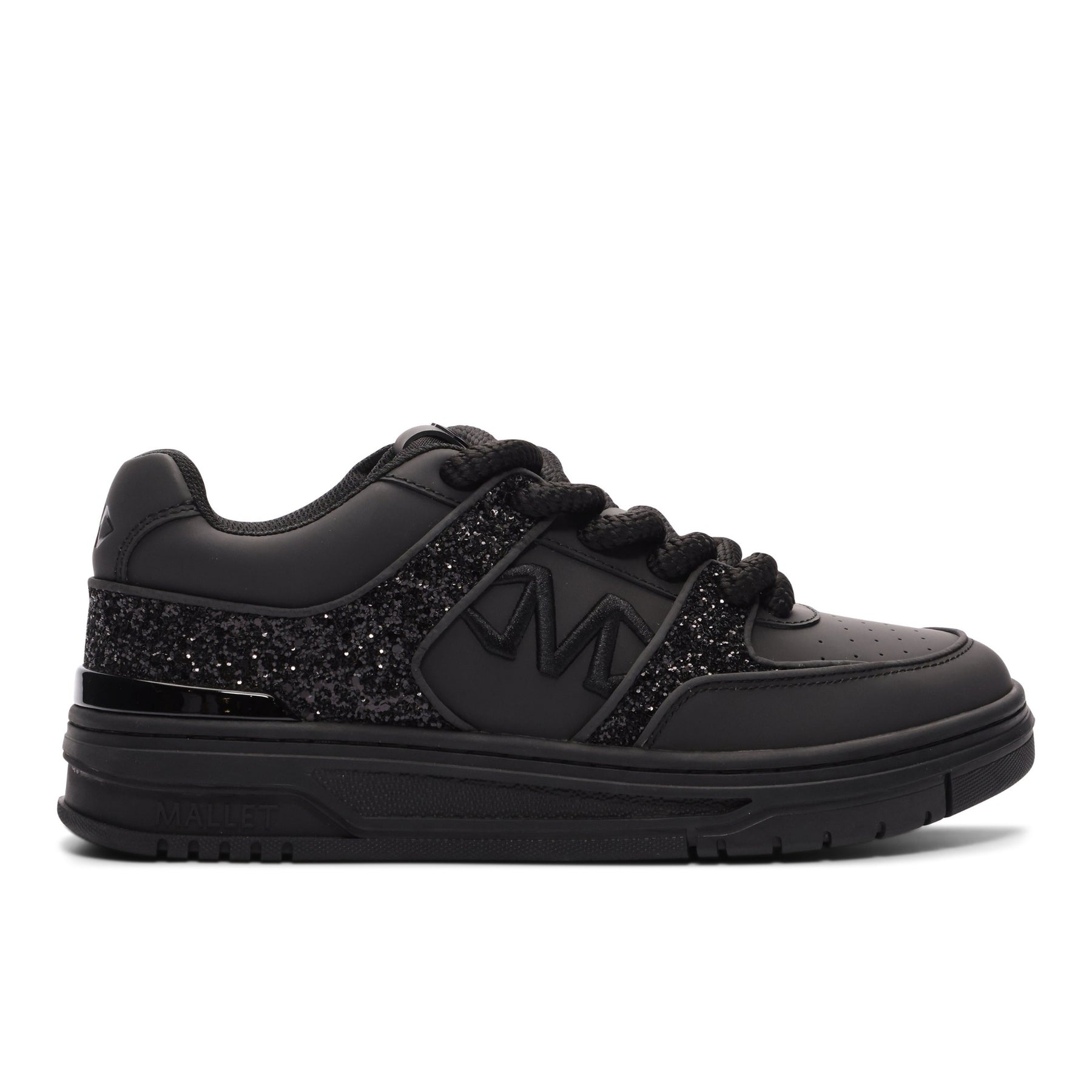 Men’s black leather low-top sneakers with chunky laces and sparkling panels