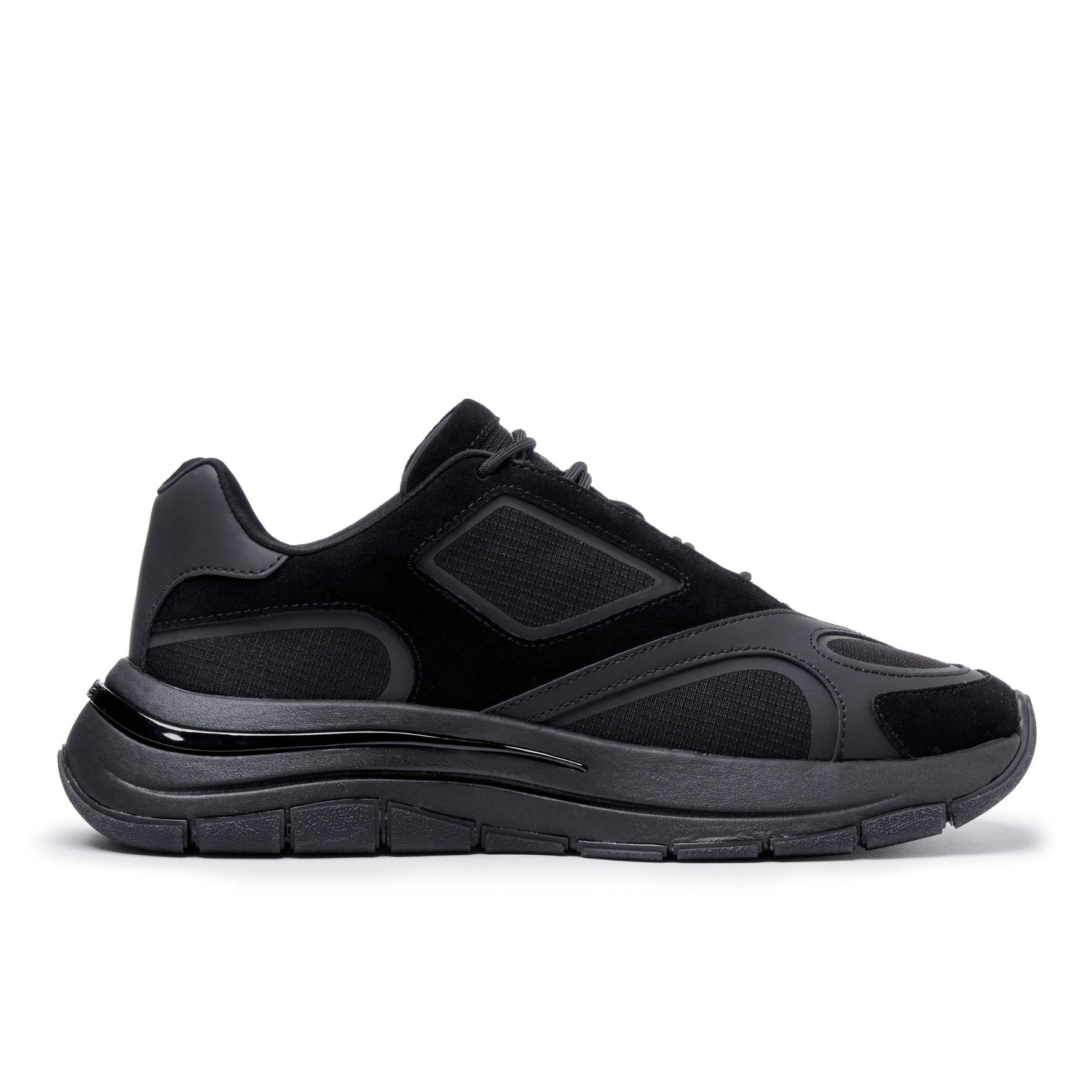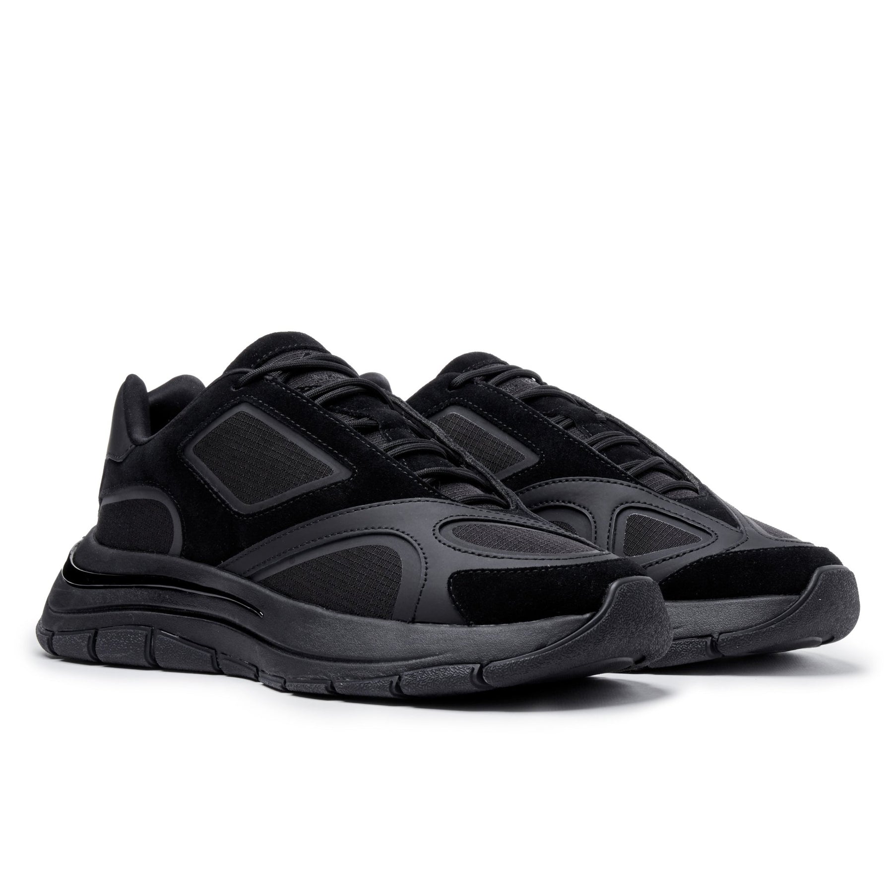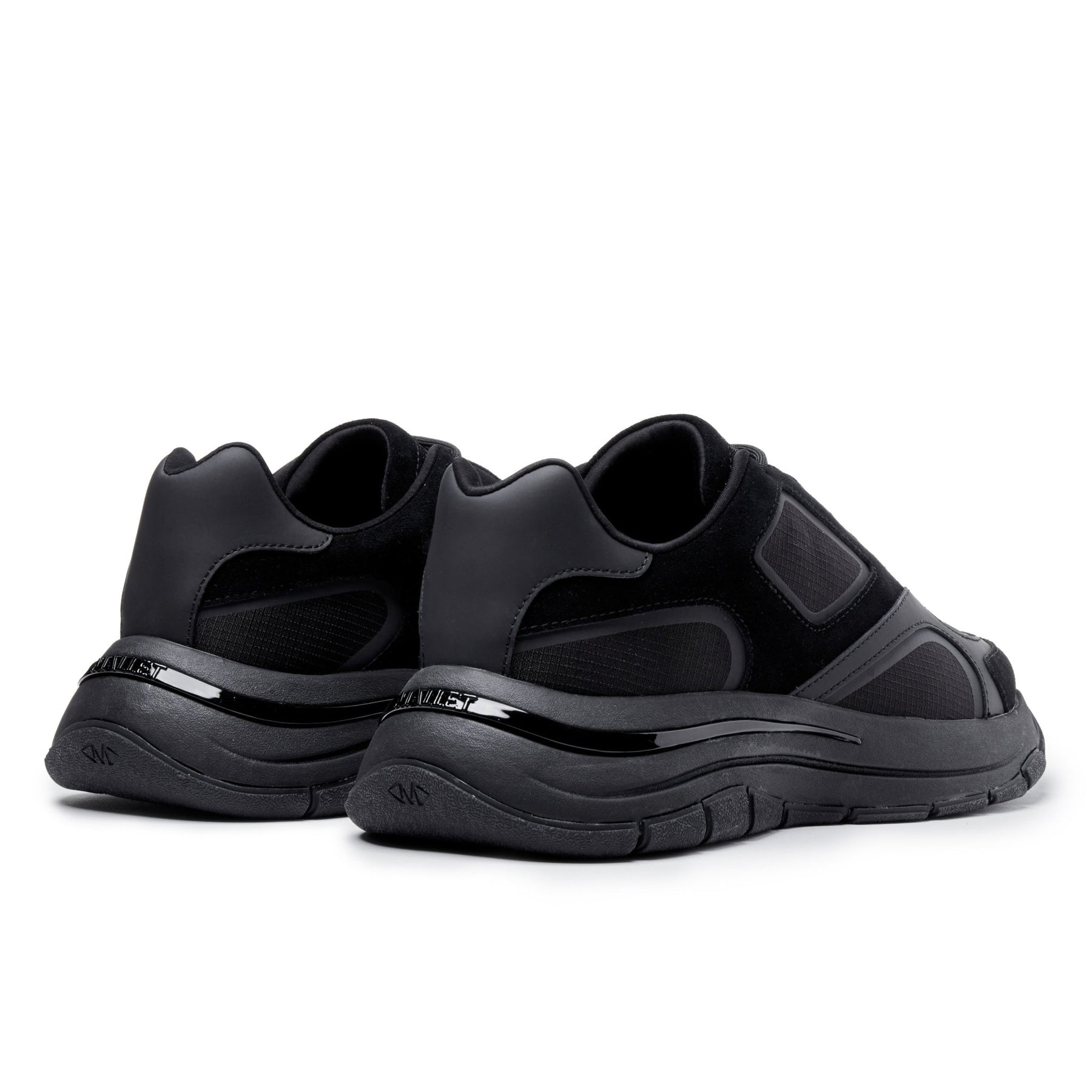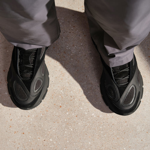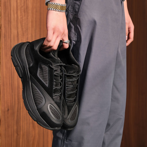 The Orb Black Out sneakers combine avant-garde design with premium streetwear styling. Designed in London, these asymmetric upper sneakers draw inspiration from distorted glass and water reflections, creating a layered silhouette in black ripstop, suede, and leather.