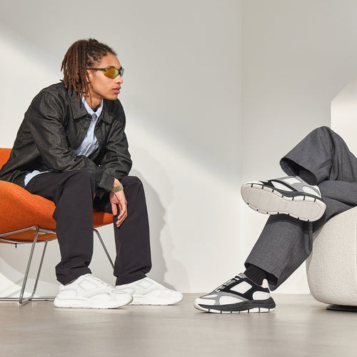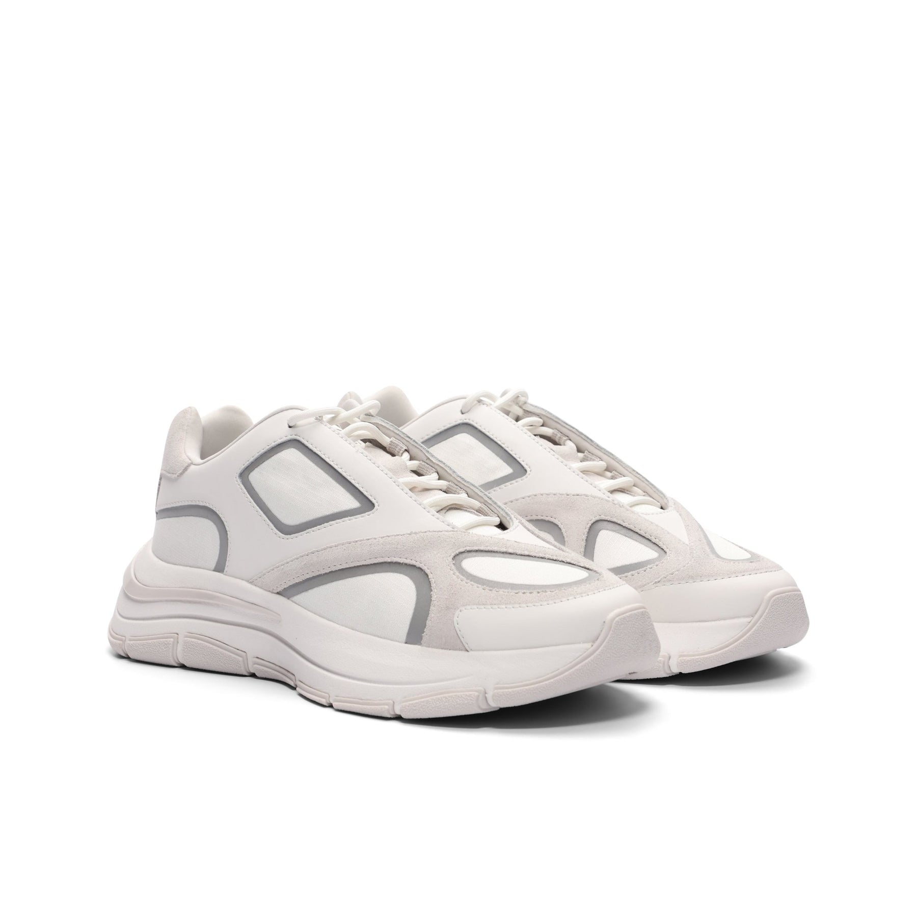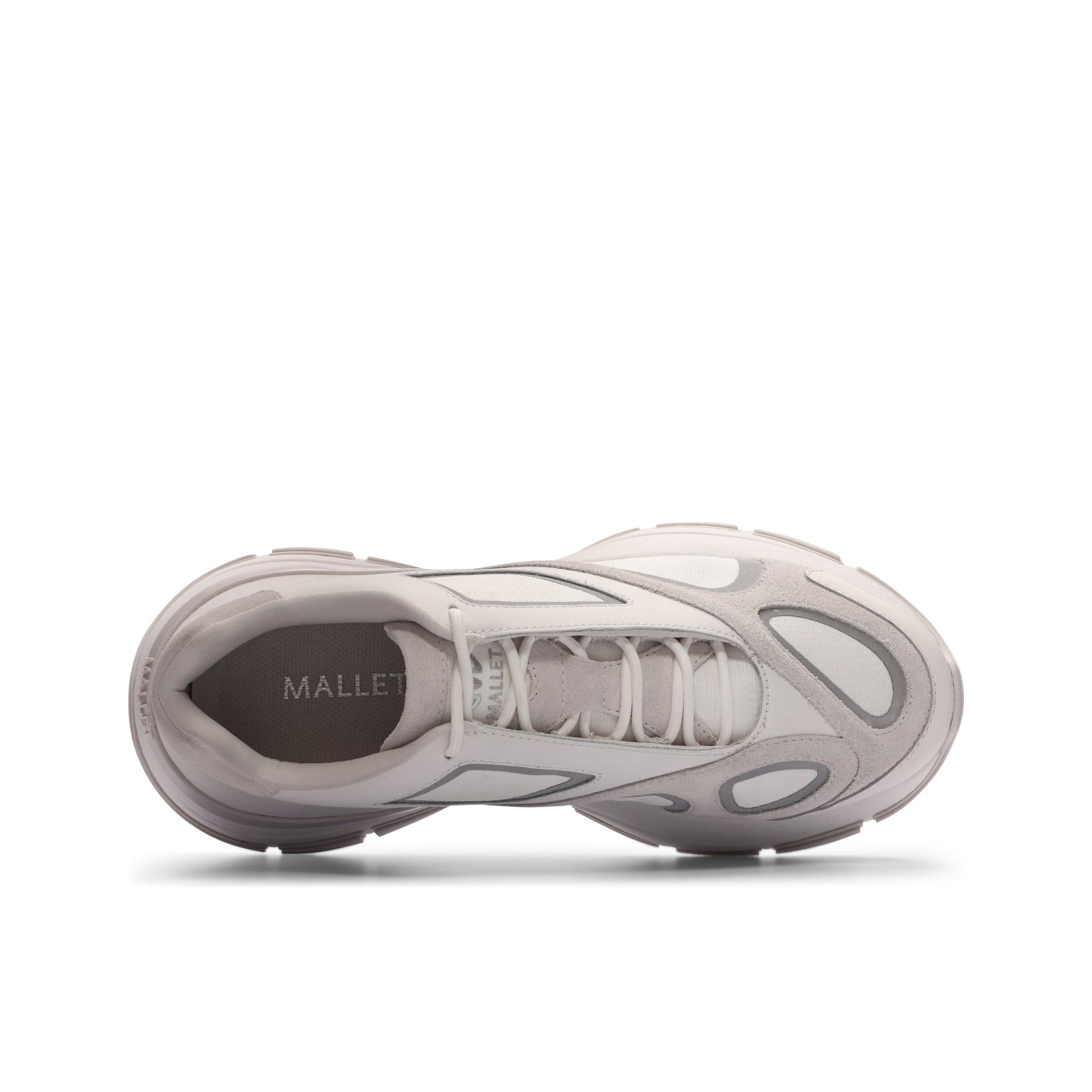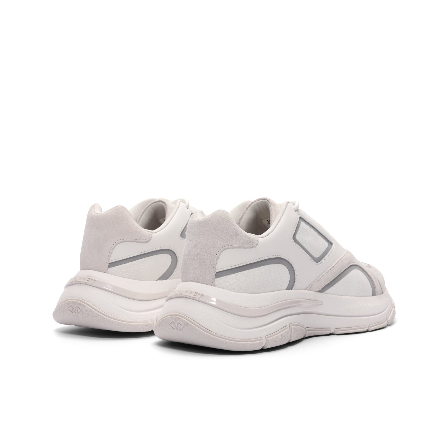 Discover the Orb White trainers, Mallet London’s first asymmetric upper design, inspired by distorted reflections in glass and water. These luxury streetwear trainers feature a modern, premium finish through the use of layered materials and subtle detailing.