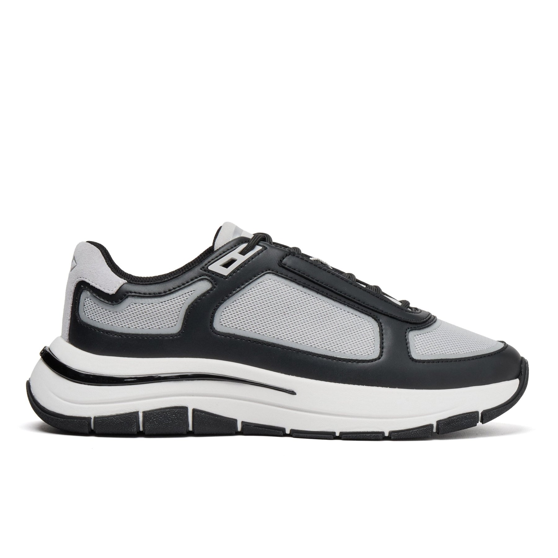 Men’s black and grey leather and chrome mesh sneakers with chunky sole