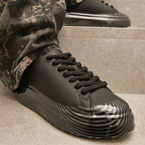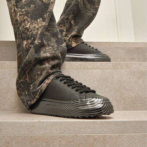 The GRFTR Lite Black Carbon Fibre Dip sneakers combine contemporary urban design with premium materials and eco-conscious innovation. Designed in London, these premium sneakers feature full black matt leather, a hand-dipped carbon fibre print sole, and OrthoLite® recycled footbed for sustainable comfort.