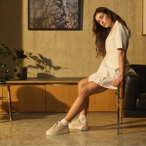 This clean cupsole sneaker pairs understated design with premium material execution. Soft almond suede, refined branding, and comfort-led construction create a modern luxury essential.