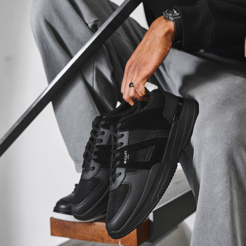 The Marquess Black Ice Grey sneakers offer a sleek, premium sports-inspired design with European streetwear sophistication. Designed in London, these sneakers feature black honeycomb mesh underlays paired with black suede and leather overlays for a contemporary layered look.