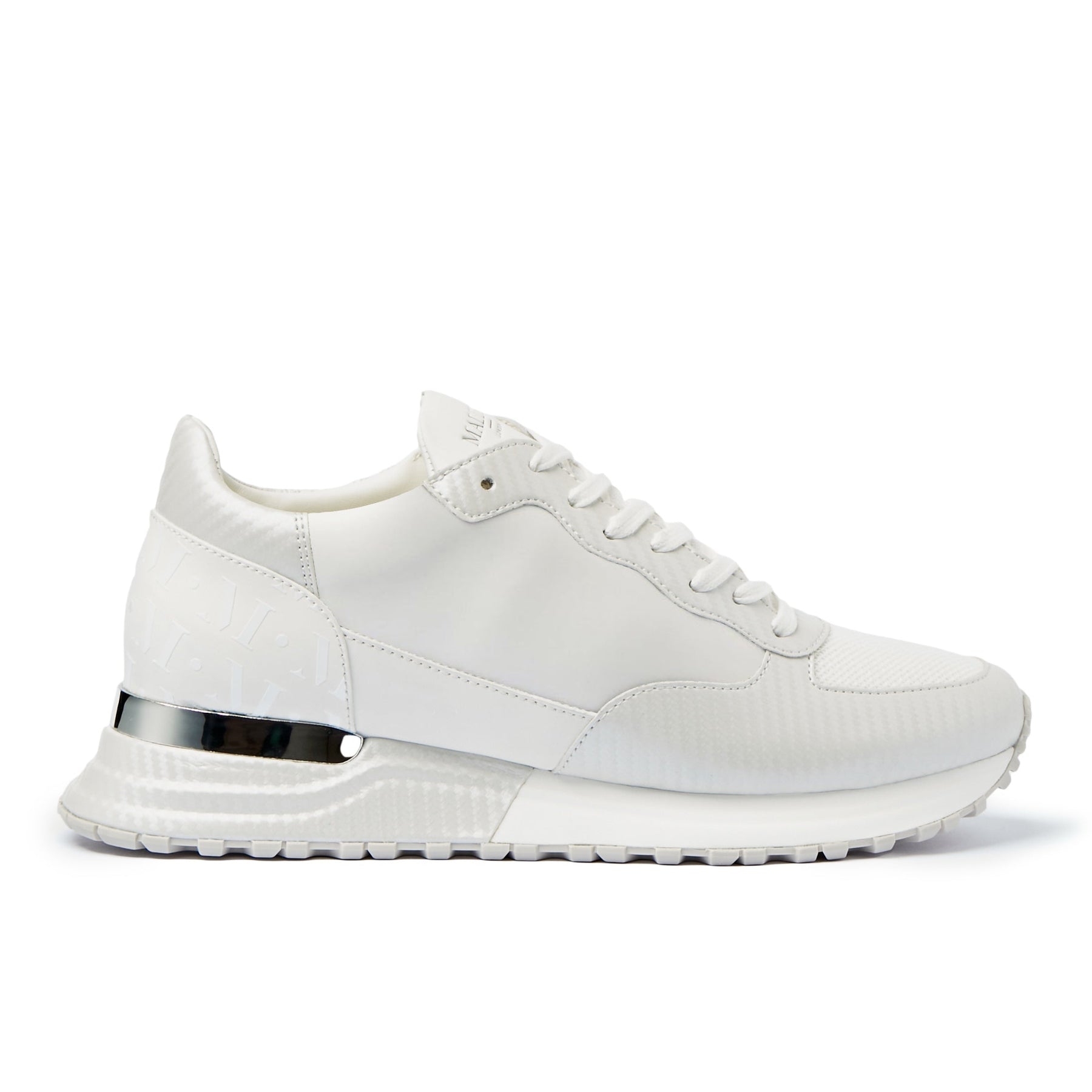 The upper features breathable white OG mesh and white leather underlays paired with striking white carbon fibre textile overlays, complemented by smooth white leather lower side quarters, heel tab, and heel counter. The heel counter is detailed with a tonal gloss Mallet monogram, adding a refined touch of brand heritage.